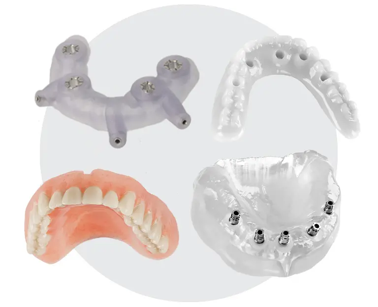 “All-on-4/6” technique allows for a full arch of teeth to be supported by just 4 or 6 implants, often enabling immediate temporary teeth in a single day.